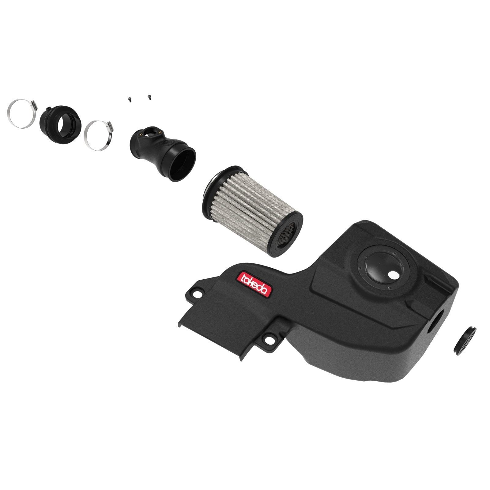 The sealed XLPE polymer housing features a rugged design, as well as a clear sight window, allowing for hassle-free filter inspection. aFe POWER’s patent pending filter-to-housing interface eliminates the use of an overabundance of parts, further simplifying the installation process. The housing utilizes the factory air inlet, using no additional hardware, and features an optional auxiliary air inlet that pulls in additional air.