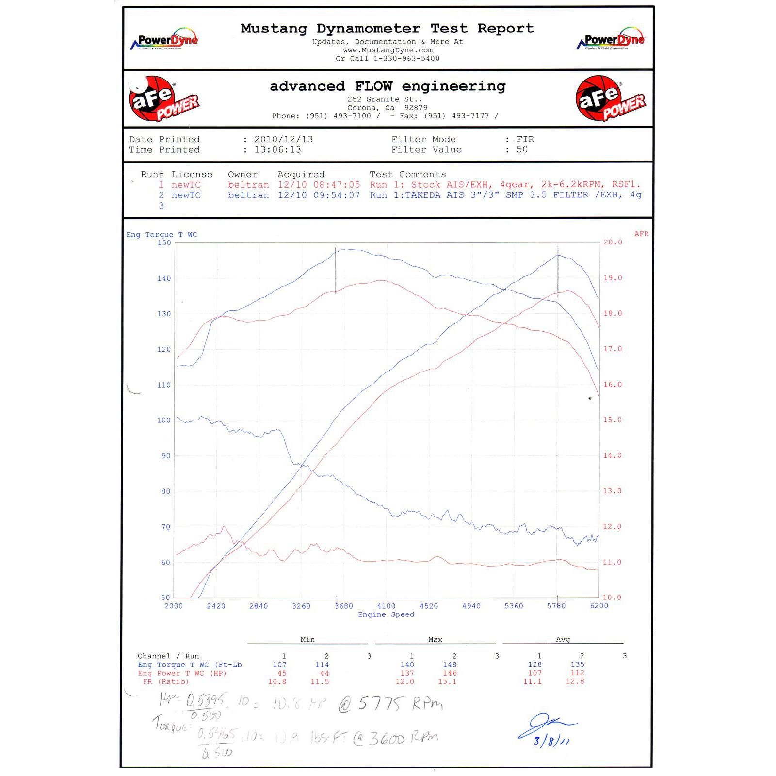 This Takeda Attack true cold air intake in recent testing produced 11 hp and 11 lbs. x ft. of torque while outflowing the factory intake by 67%. Takeda intakes are constructed out of lightweight clear-coat anodized tubing for maximum air flow and a great style. Each intake uses a large 360 degree high flow Pro DRY S air filter for maximum flow, filtration and convenience. The Pro DRY S air filter requires no oil and cleans with simple soap and water. Takeda intakes come complete with all tubing, filters, couplings and hardware for an easy installation.