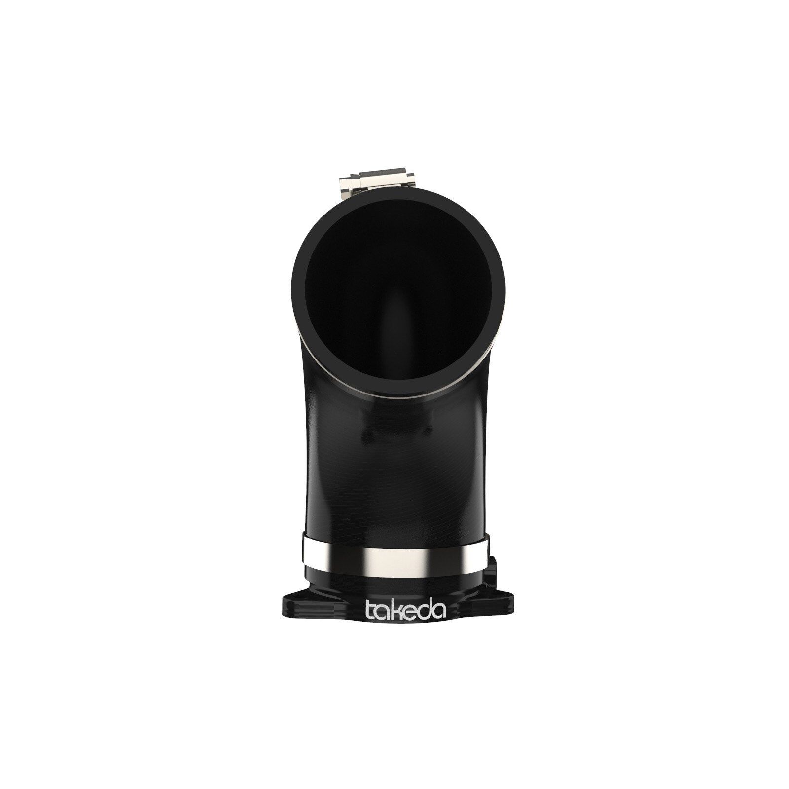 Precisely CNC machined out of 6061-T6 billet aluminum, the adapter mounts directly onto the turbo and guides the increased air flow from the Takeda intake into the turbo. It is black anodized for durability and a stealthy appearance.